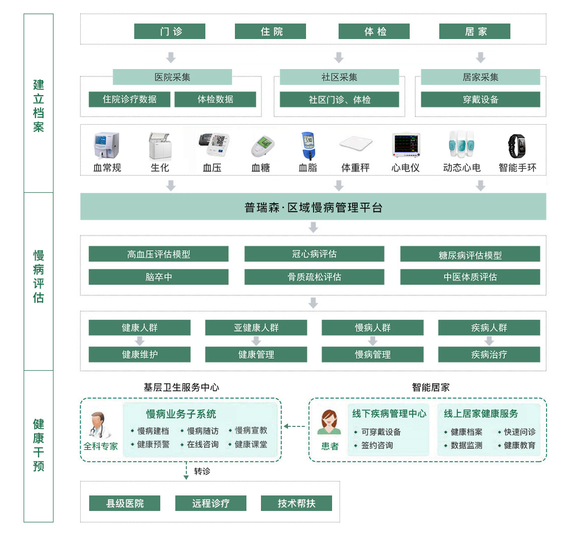 慢病管理整體解決方案通過建立一個覆蓋醫(yī)院、社區(qū)服務中心、鄉(xiāng)鎮(zhèn)衛(wèi)生院以及村衛(wèi)生室的區(qū)域慢病管理平臺,通過整合門診、住院、體檢等健康數(shù)據(jù)和采集慢病健康自助一體機、健康隨訪包等設備健康信息,打造區(qū)域慢病大數(shù)據(jù)中心,為當?shù)芈「呶;颊哌M行高效篩選、有效評估、精準干預、及時隨訪等一體化的健康管理閉環(huán)服務,從而快速打造慢病防治干預的三級(二級醫(yī)院、鄉(xiāng)鎮(zhèn)衛(wèi)生院/社區(qū)衛(wèi)生院、村衛(wèi)生室)服務體系,有效提高慢病管理的效率。